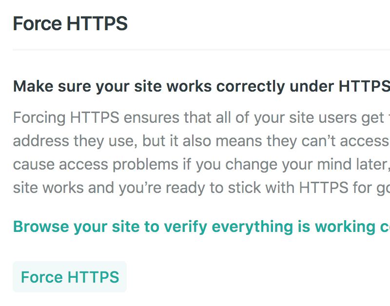 在第四步 Domain settings 再往下翻一点,可以看到 Force HTTPS,只需点击 Force HTTPS 即可实现,是不是很方便,如下图: