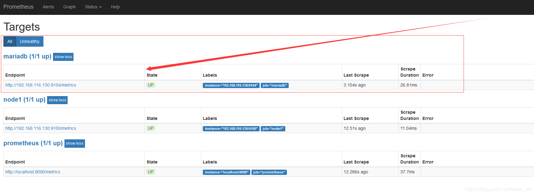 ③ 回到web管理界面 --》点Status --》点Targets --》可以看到监控 mariadb了