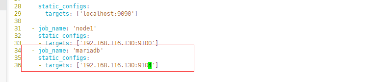 ② 回到prometheus服务器的配置文件里添加被监控的mariadb的配置段