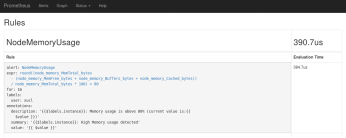 expr: round((node_memory_MemTotal_bytes - (node_memory_MemFree_bytes+node_memory_Buffers_bytes+node_memory_Cached_bytes )) / node_memory_MemTotal_bytes * 100) > 80