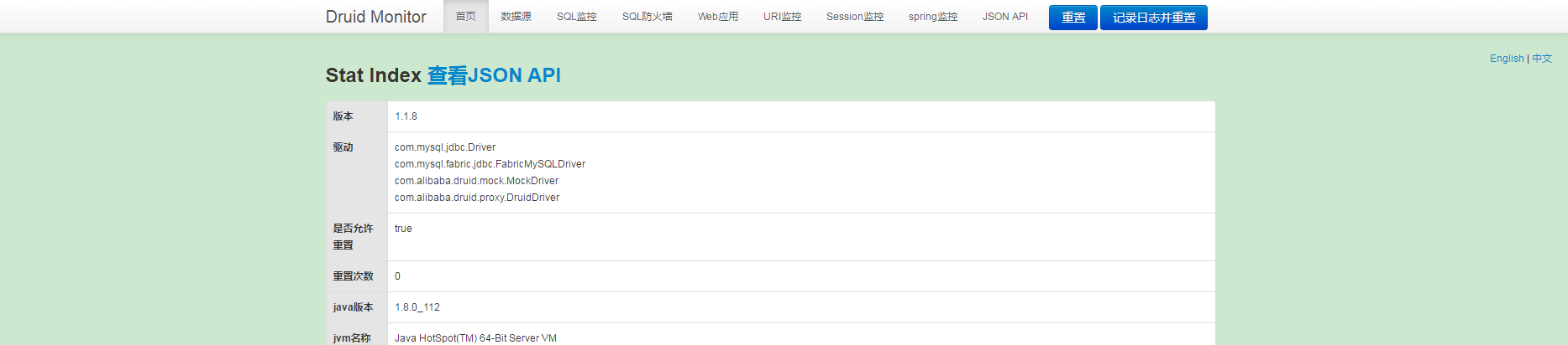 然后启动项目,在浏览器中输入地址http://127.0.0.1:8080/user对数据库中的user表进行查询后,再访问http://127.0.0.1:8080/druid将会显示页面如下,可以对数据源、sql监控等进行查询: