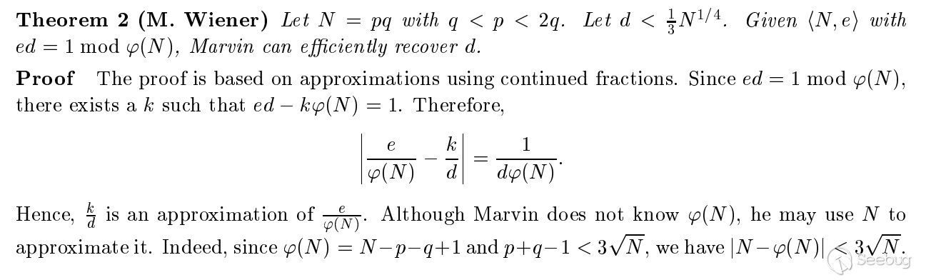 详细的证明过程见: M. Wiener. Cryptanalysis of short RSA secret exponents. IEEE Transactions on Information Theory, 36:553-558, 1990。