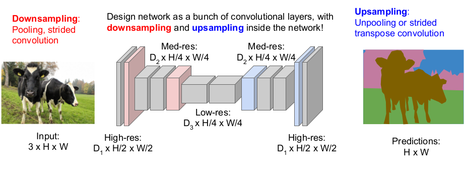 Fully convolutional: Design network as a bunch of convolutional layers, with downsampling and upsampling inside the network!