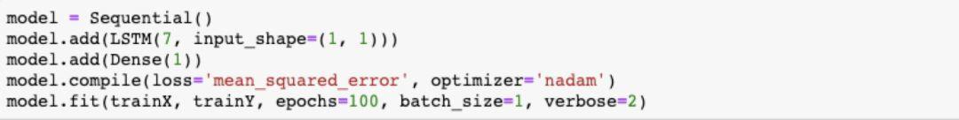 选定模型训练的epoch(总的训练轮数)为100和batch size(每次训练的样本数)为1,并在LSTM层的输出后面加入一个普通的神经网络全连接层用于输出结果的降维。