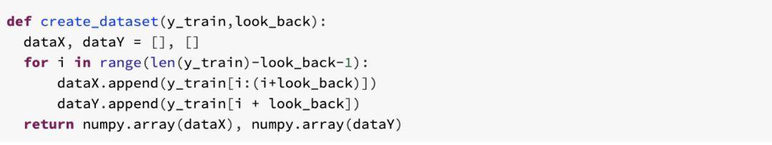 在这里窗口长度为1,即用t次的时间间隔进行模型训练,然后用t+1次的时间间隔对结果进行验证。数据集格式为:dataX为训练数据,dataY为验证数据。我们选取数据集中前36的数据作为训练集,后6的数据作为测试样本集。