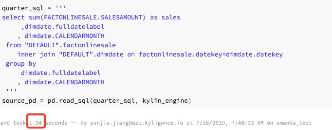 数据源与分析平台无缝连接以往的大数据在被分布式计算后,如果想用机器学习进一步分析,往往需要将数据导出,再导入机器学习分析平台。而Kyligence和Databricks的组合允许用户直接从数据分析平台上获取数据,无需导入导出。在Databricks的notebook中,用户可通过SQL语句直接获取被Kyligence预聚合的数据,省去迁移数据,转换数据格式的麻烦。