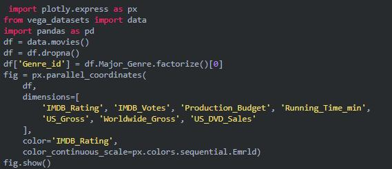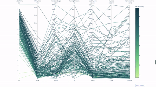 平行坐标图是上面的图表的连续版本。这里,每一根弦都代表单个观察。这是一种可用于识别离群值(远离其它数据的单条线)、聚类、趋势和冗余变量(比如如果两个变量在每个观察上的值都相近,那么它们将位于同一水平线上,表示存在冗余)的好用工具。