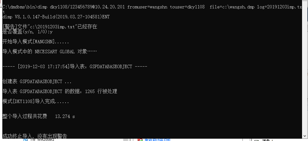 dimp dky1108/123456789@10.24.20.201 fromuser=wangshn touser=dky1108 file=c:\wangsh.dmp log=20191203imp.txt