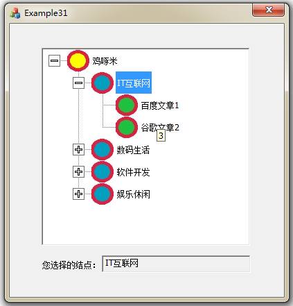 此实例实现的功能:在一个树形控件中显示鸡啄米网站的简单结构分层,共有三层,分别为鸡啄米网站、各个分类和文章。用鼠标左键单击改变选中节点后,将选中节点的文本显示到编辑框中。另外,还要实现一个常见的效果,就是鼠标划过除根节点外的某个树节点时,显示相应的Tip提示信息。下面是具体实现步骤: