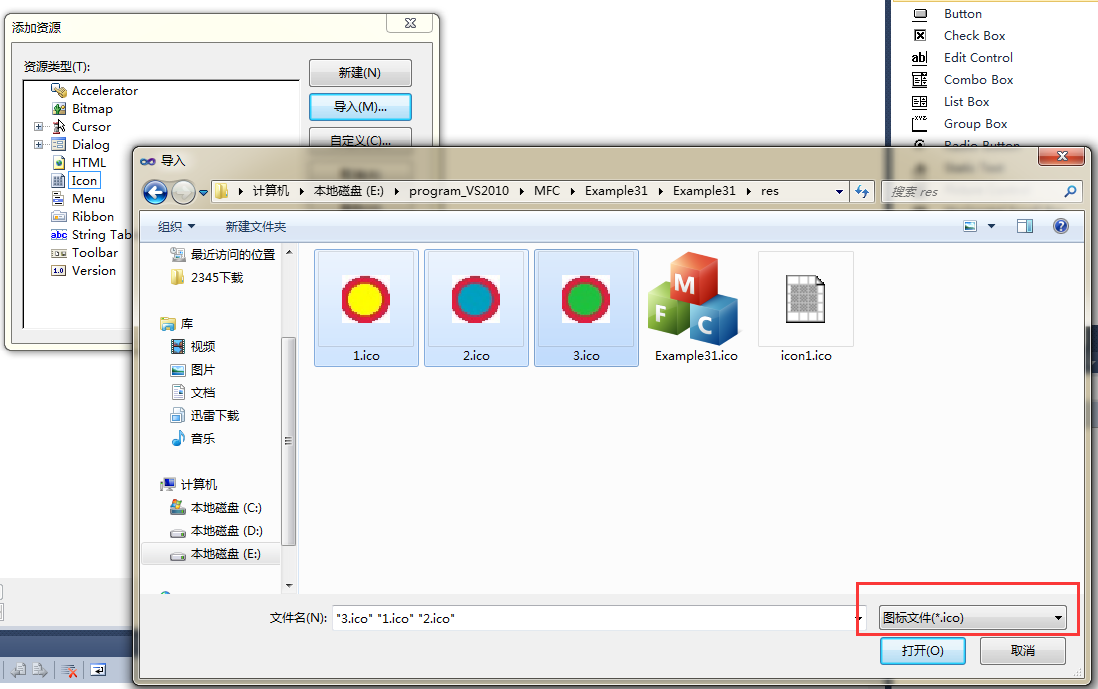 然后在Resource View资源视图中,右键点击Icon节点,在右键菜单中选择“Add Resource...”,弹出“Add Resource”对话框,再从左边“Resource type”列表中选择“Icon”,点击右边的“Import...”按钮,就可以选择三个图标文件进行导入了。【PS:注意导入的图片格式是 .ico 】