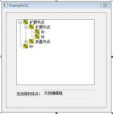 2. 在自动生成的对话框模板IDD_EXAMPLE31_DIALOG中,删除“TODO: Place dialog controls here.”静态文本框、“OK”按钮和“Cancel”按钮。添加一个Tree Control控件,ID设置为IDC_WEB_TREE,属性Has Buttons、Has Lines和Lines At Root都设为True,为了在鼠标划过某个节点时显示提示信息还需要将Info Tip属性设为True。再添加一个静态文本框和一个编辑框,静态文本框的Caption属性设为“您选择的节点:”,编辑框的ID设为IDC_ITEM_SEL_EDIT,Read Only属性设为True。此时的对话框模板如下图:
