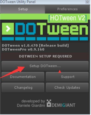 - 或者是导入插件之后基本操作: 导入----> Tools ----> DOTween Utility Panel点击打开----> 点击SetupDoTween即可;[注:该步操作大都是为了版本的问题,若导入的时候提醒版本更新等的,点击更新确认即可]
