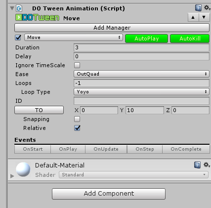 此处的Move[移动]是相对于世界坐标来说的,栗子:向(0,10,0)的位置来回运动,用时3秒