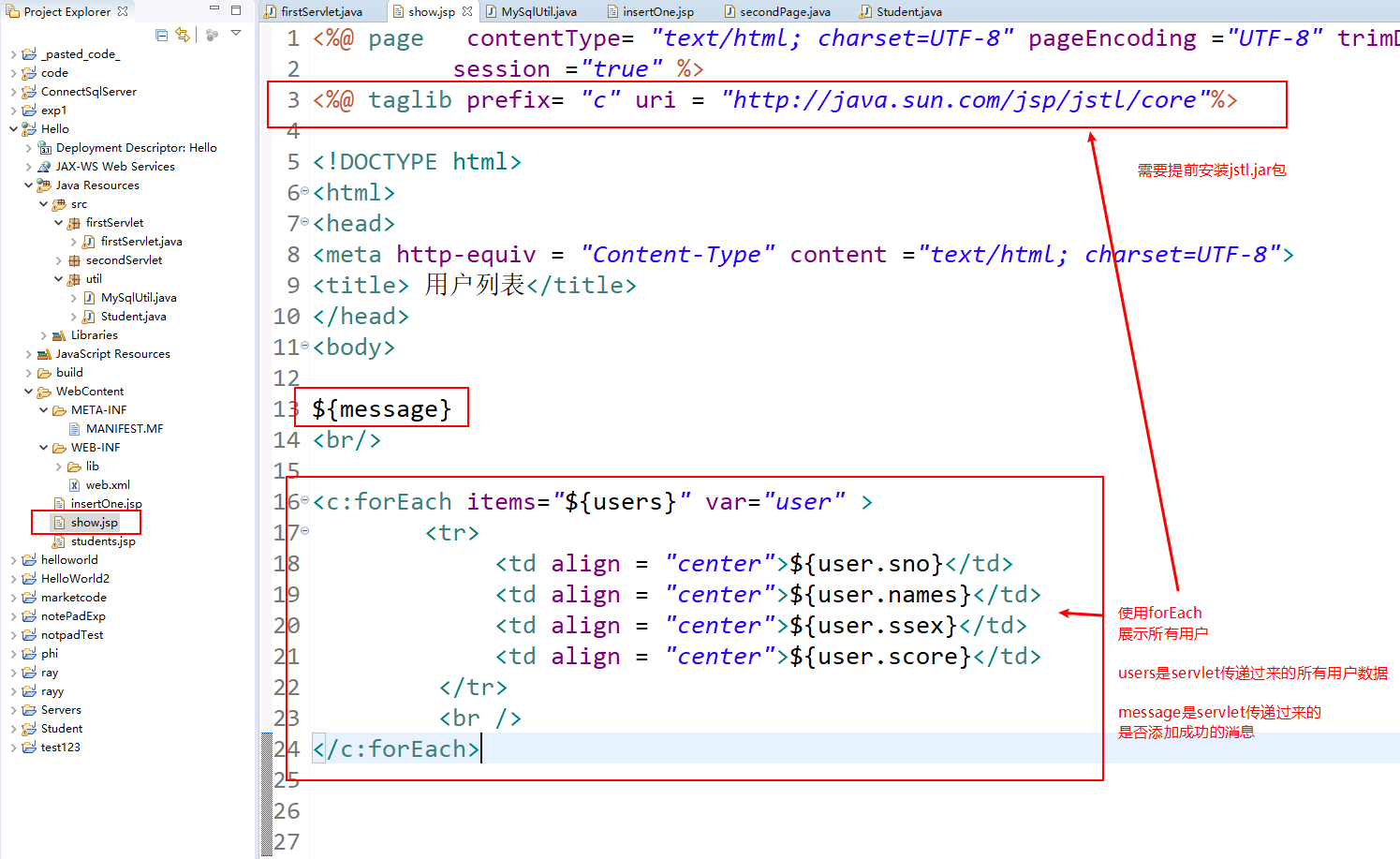 ##5.show.jsp,还是视图层,上面的servlet转发响应到这个show页面,展示所有用户信息,c:forEach标签遍历所有学生信息