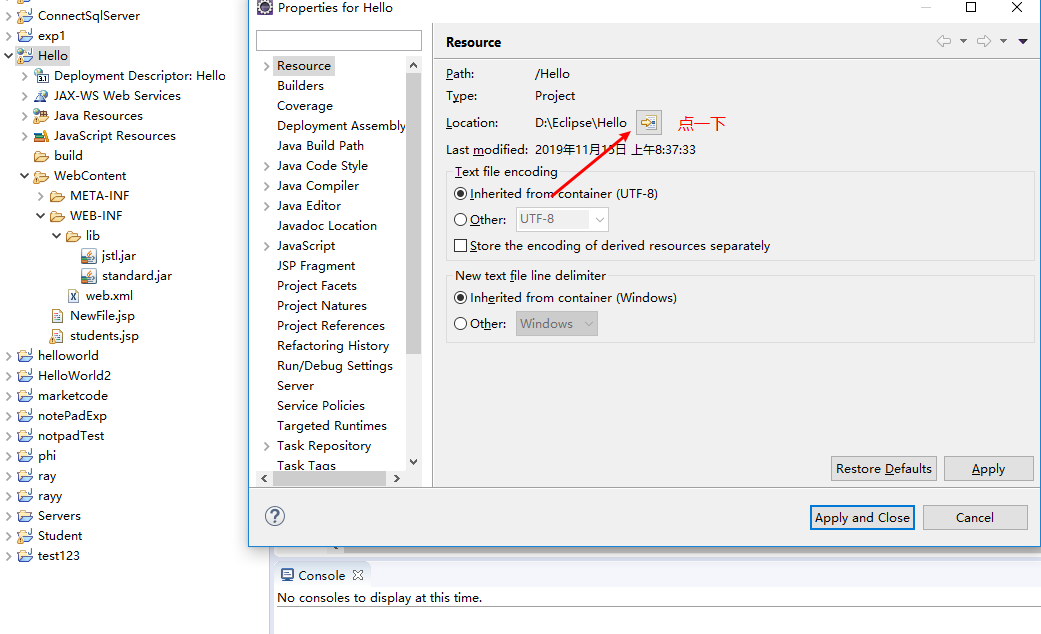 <br /> 进入属性窗口,可以看到目录了,点击就能进入项目目录了,把这两个jar文件放在项目目录的WEB-INF/lib文件夹里