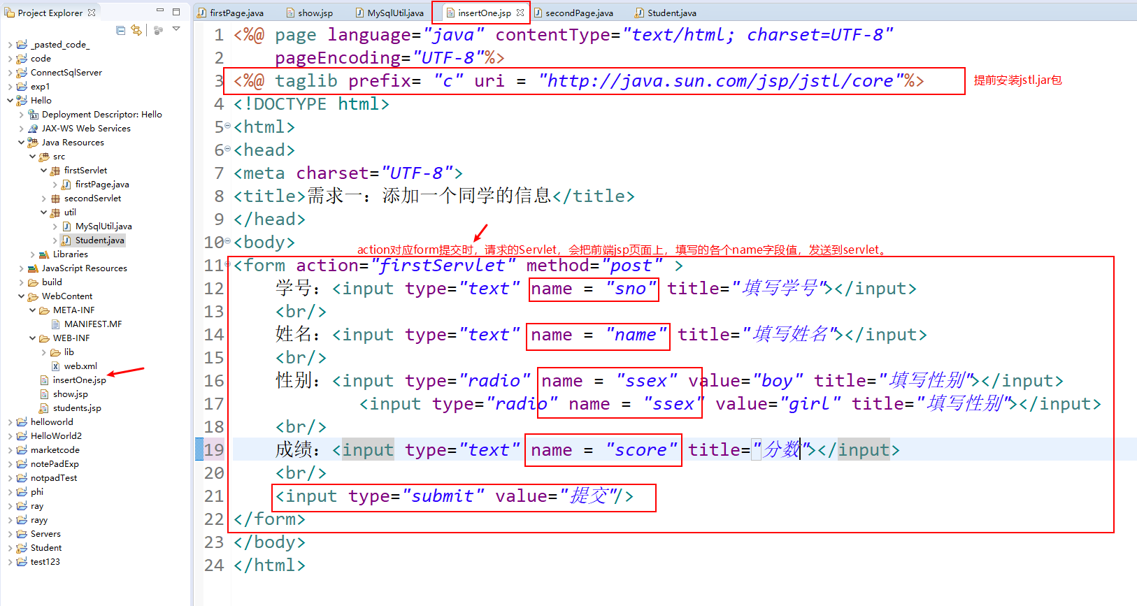 ##4.firstServlet.java,控制层(controller层),编写的servlet代码,从前端jsp页面获取到学生数据,处理第一个问题的添加学生信息的功能。 如何获取到form表单提交的数据?主要就是用request.getParmeter("form表单中字段的name"),得到一个字符串;具体看代码吧