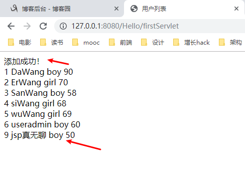 <br /> 就这样,浏览器端页面虽然比较丑,但是麻雀虽小,五脏俱全,主要是理解mvc吧,以后的javaWeb框架比如springmvc、springboot也都是mvc这种设计模式 Tomcat+Servlet+Sql,感觉完全可以开发一个小的毕设项目了。 jsp页面写得太烦了,各种代码杂糅在一起,现代人基本都不用了吧。<a href="https://www.bilibili.com/video/av68821481" target="_blank">现在比较流行前后端分离,后端返回数据接口,前端请求接口和渲染数据,</a>