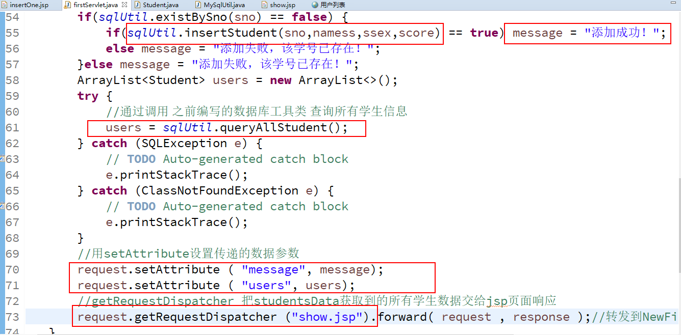 if(sqlUtil.insertStudent(sno,namess,ssex,score) == true) message = "添加成功!";