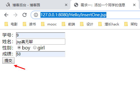 ##6.网页端效果: 浏览器访问这个地址:http://127.0.0.1:8080/Hello/insertOne.jsp 效果如下👇,