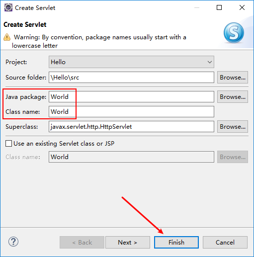 输入名字后,直接点击Finish,自动生成了servlet文件
