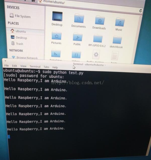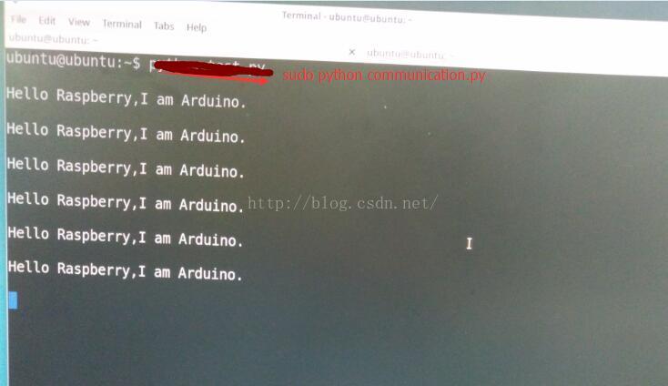 此图是两者之间的通信结果:树莓派向arduino发送一个字符‘s’,arduino向树莓派回复字符串“hello raspberry,i am arduino”。