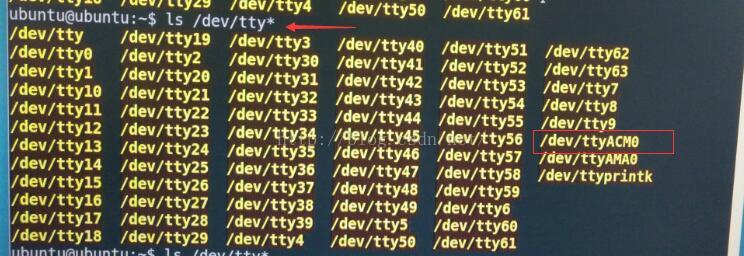 2、在树莓派终端输入 ls /dev/tty*查看两者连接端口的名字。查看有没有ttyACM0 这个文件(注只有在两个硬件USB互连的情况下才会有这个。如果两者没有连接是不会有的) 最新的系统一般都会自动生成。看到ttyACM0就说明二者可以通讯了 接下来上测试代码。