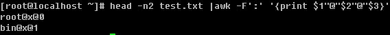 8. awk -F':' '{print $1"@"$NF}' test.txt