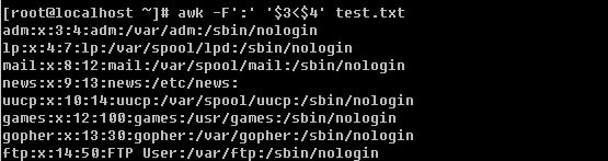 7. 用’:’作为分隔符,打印所有第三段小于第四段的行;