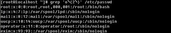 这里用到了{ },其内部为数字,表示前面的字符要重复的次数。上例中表示包含有两个o 即’oo’的行。注意,{ }左右都需要加上脱意字符’\’。另外,使用{ }我们还可以表示一个范围的,具体格式是 ‘\{n1,n2\}’其中n1<n2< span="">,表示重复n1到n2次前面的字符,n2还可以为空,则表示大于等于n1次。