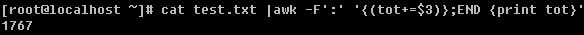 9. awk -F':' '{(sum+=$4)}; END {print sum}' test.txt
