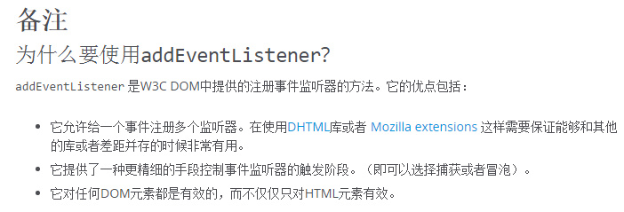 - 可以支持事件处理的捕获阶段,也可以支持时间处理的冒泡阶段,两个阶段都是通过addEventListener最后一个参数设置为false(默认值,表示事件冒泡)或者true(表示事件捕获)来切换