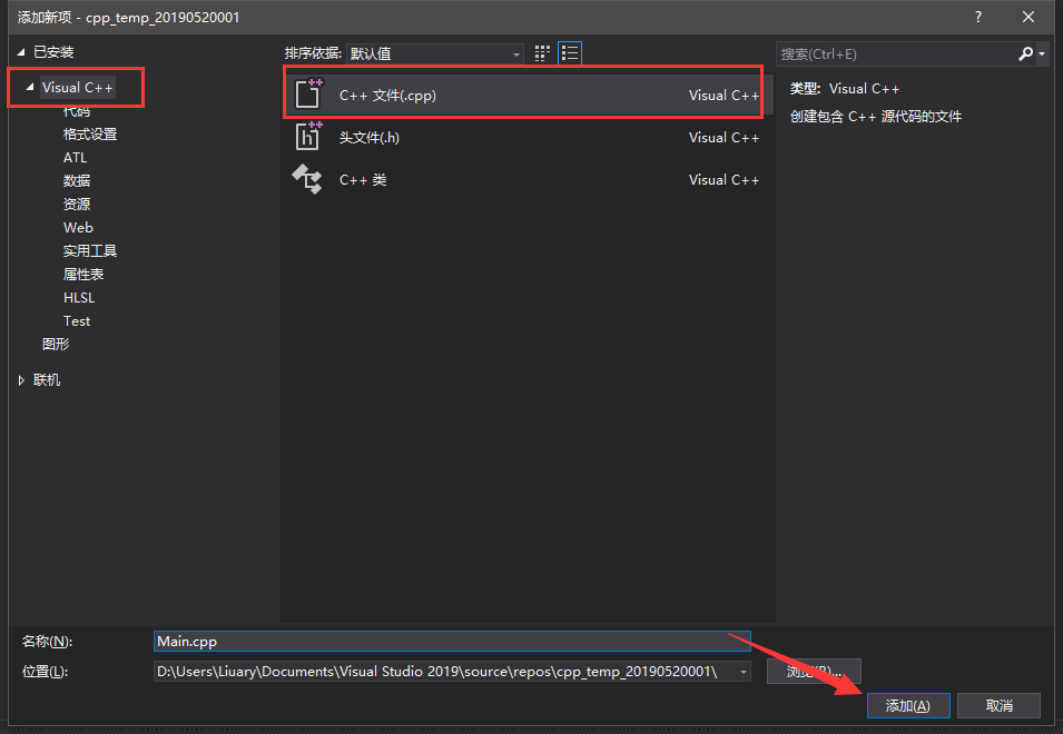 第五步,在 添加新项窗口中左侧点击Visual C++,选择中央的 C++文件,起个名字然后点击添加。