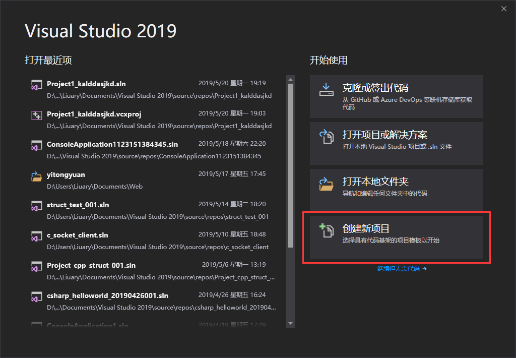 第一步,打开Visual Studio,单击创建新项目。
