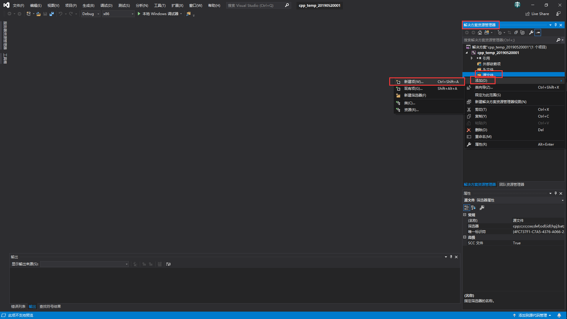 第四步,在解决方案资源管理器中的 项目名>>源文件 文件夹上右键 添加>>新建项 。