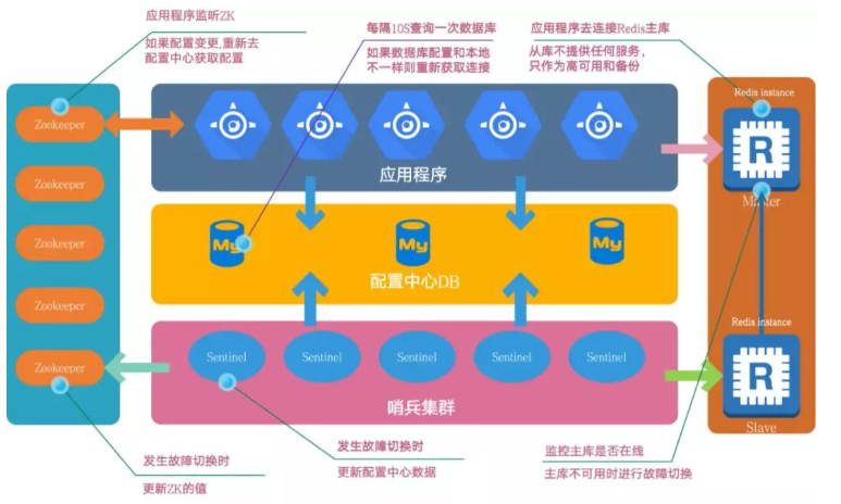 应用程序客户端:监听 zk 变化,在配置中心获取 Redis 实例信息进行连接。