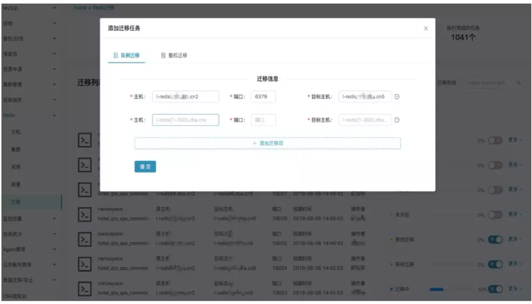 整机实例迁移。主要是替换过保服务器或者服务器需要停机维护时,将该机器上的所有实例自动迁移到其他资源比较空间的服务器上。在页面输入需要迁移的主机名,提交后会自动生成迁移任务。