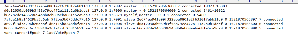 这个配置文件就是记录集群主从节点的信息:节点id ,分配的slot 的份额,主从标识,以及主从的映射关系