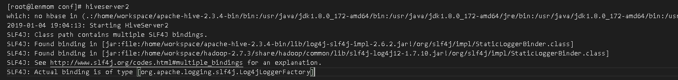 SLF4J: Found binding in [jar:file:/home/lenmom/workspace/software/apache-hive-2.3.4-bin/lib/log4j-slf4j-impl-2.6.2.jar!/org/slf4j/impl/StaticLoggerBinder.class]
