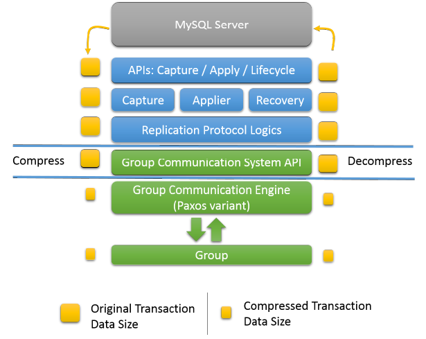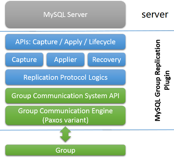 - 最后两层是组内通信系统(GCS)的API(第一个绿色方框),以及一个基于Paxos组通信引擎的实现(implementation)(第二个绿色方框)。