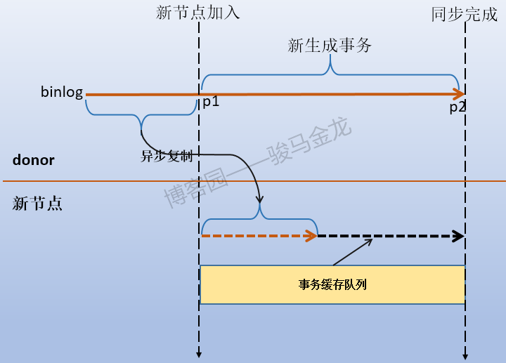 所以将恢复过程概括一下:新节点的recovery组件通过异步复制通道从donor处获取p1之前的所有数据,并监控组中新生成的事务放入自己的事务缓存队列中。当新节点将p1之前的数据恢复完成后,将执行缓存队列中的事务,直到缓存中的事务数量减为0后,才表示新节点已经完全赶上了组中的数据,这是它才可以标识为ONLINE,并真正成为组中的一员。