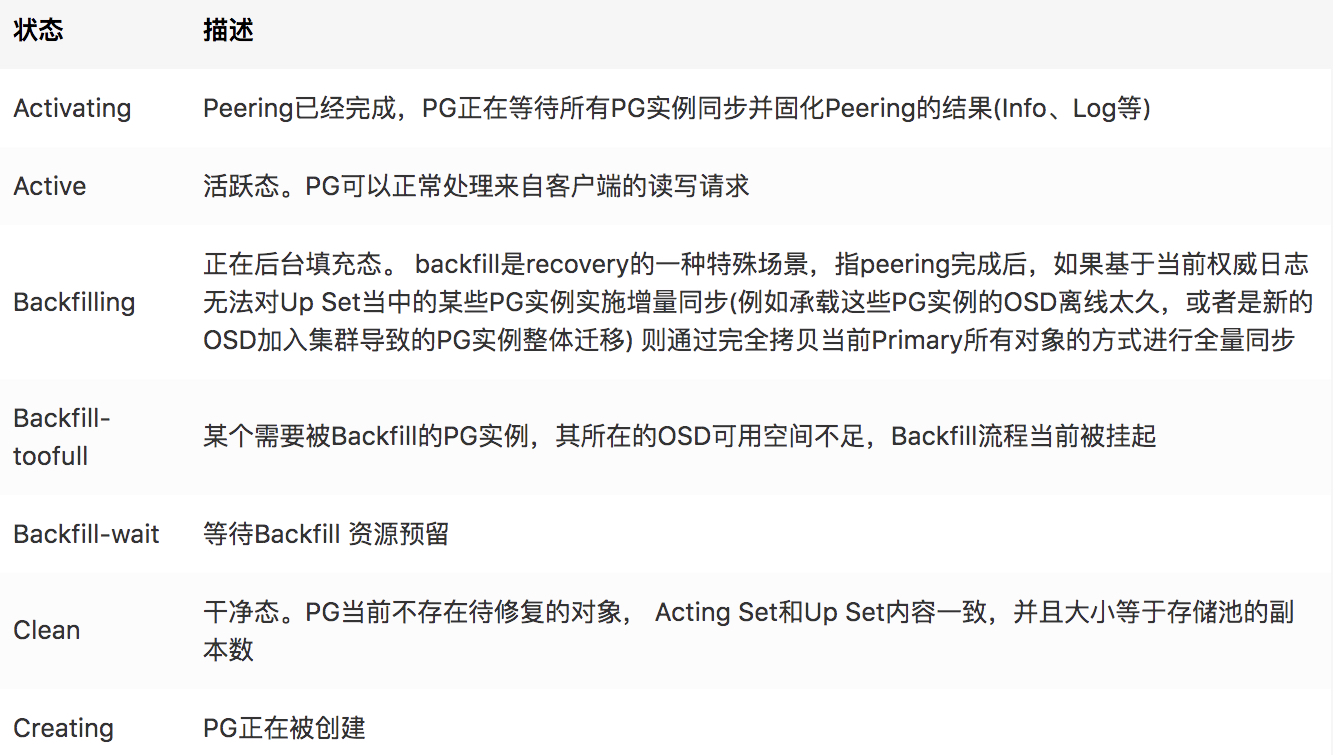 如果Ceph也报告PG的其他的警告或者错误状态。PG状态表: