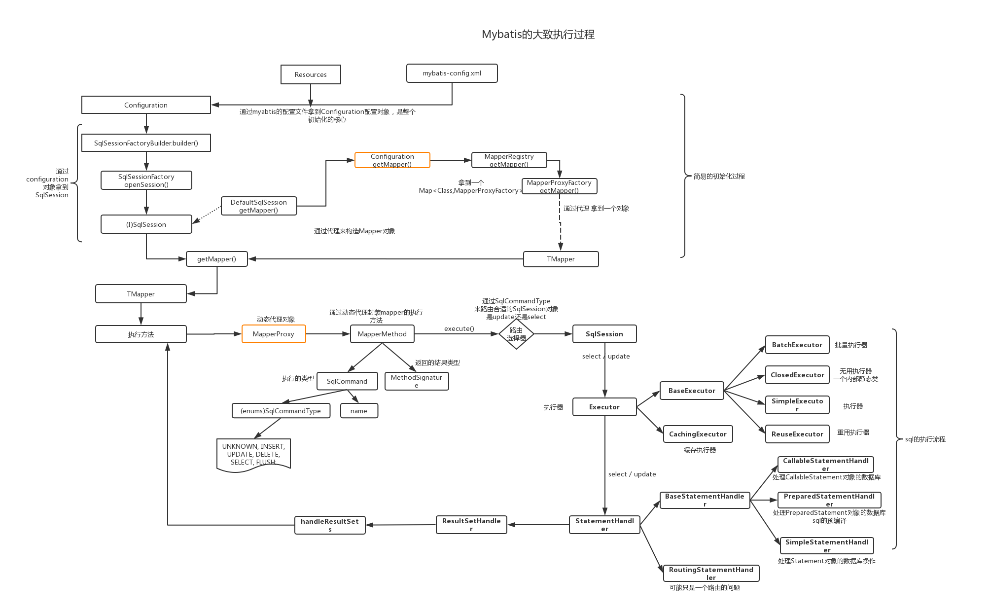 首先是通过XMLConfigBuilder解析 mybatis-config.xml 对象来进行初始化,拿到Configuration对象,然后SqlSessionFactoryBuilder通过初始化的Configuration对象,生成SqlSession,SqlSession中调用getMapper对象方法,其实也就是Configuration中的getMapper方法 通过MapperProxy代理对象生成一个mapper。到这里位置就是一个简单的初初始化思路了!当然Mybatis的初始化远远不止这些。