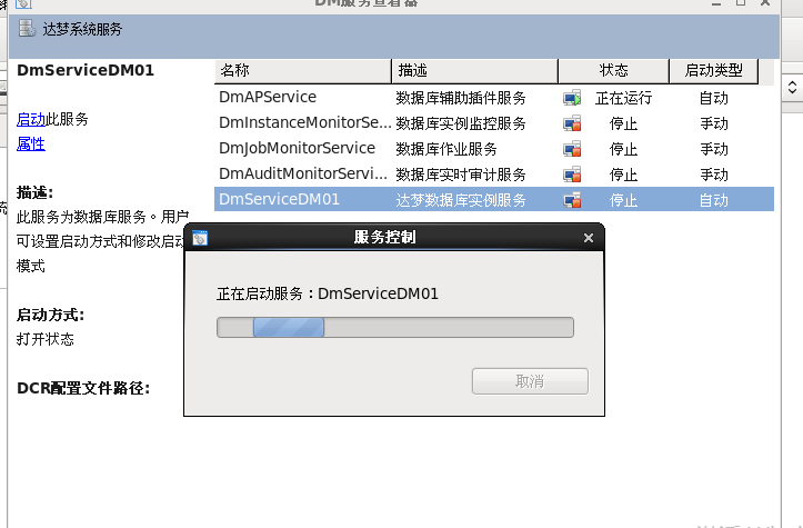 在DM服务查看器中找到数据库实例服务DmServiceDM01,右键启动服务