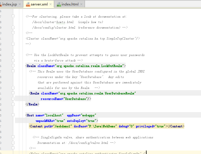 <Context path="/webdemo1" docBase="F:\Java\WebDemo" debug="0" privileged="true"></Context>
