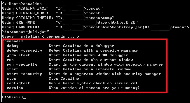 5、在从命令行启动tomcat,此时成功。启动是成功了,但是会发现重新打开了一个命令行窗口,怎么样让它在同一个窗口下呢?由上面可知在startup.bat里调用了catalina.bat命令,于是我们在命令行里输入:catalina,得到如果信息: