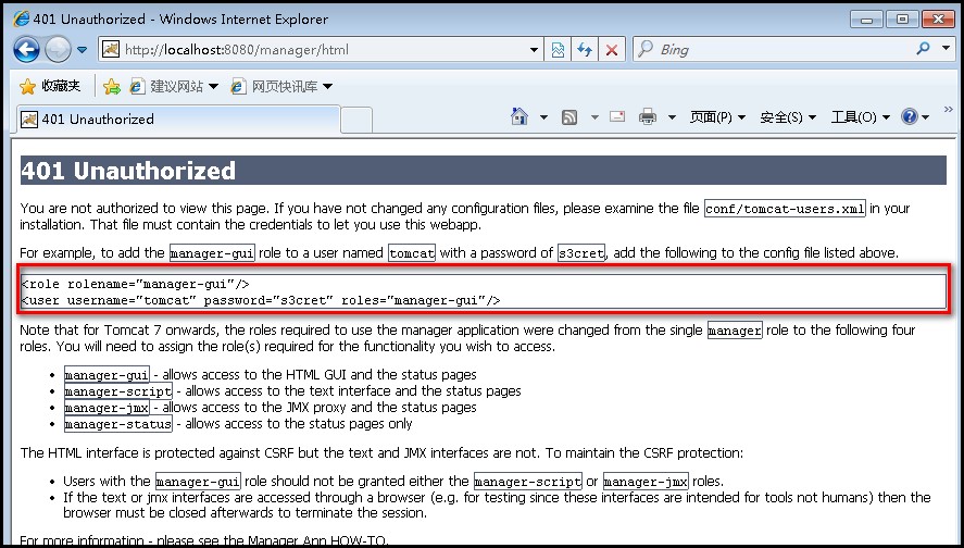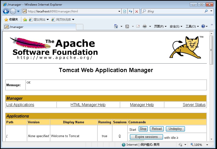 4、按图上提示,把红色部分添加到comf/tomcat-users.xml下,然后重新从步骤1开始,此时会登录成功,进到一个tomcat管理页面,可以看到当前有哪些项目部署在tomcat ,也可以从这里进入某个项目中: