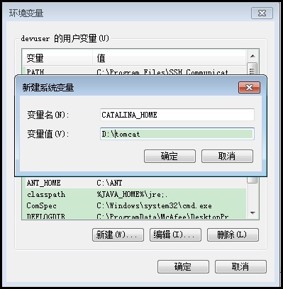 4、根据以上信息添加环境变量,D:\tomcat是我的安装目录:
