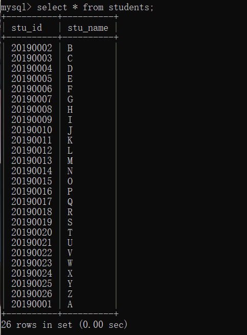 这次使用的数据库是 MySQL,建了一个表 students,这个表只有两个字段:stu_id 和 stu_name,表中数据如下: