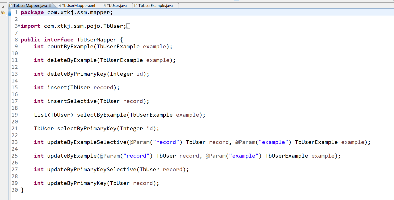 可以看到mapper包和pojo包下的文件以及其中的内容都自动生成了。比之前方便多了,我就指定了一张表,所以只有一个 mapper.java 和一个 mapper.xml,当然在配置文件里也可以指定多张表。这里值得一说的是相比之前自己写,逆向工程pojo包下多了一个*Example.java文件,这个类是用来自定义条件查询的。具体的使用可以去看我的下一篇博客。