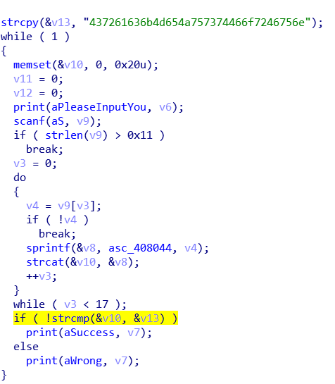 12 while ( (signed int)v5 < strlen(s) ) // s=c61b68366edeb7bdce3c6820314b7498
